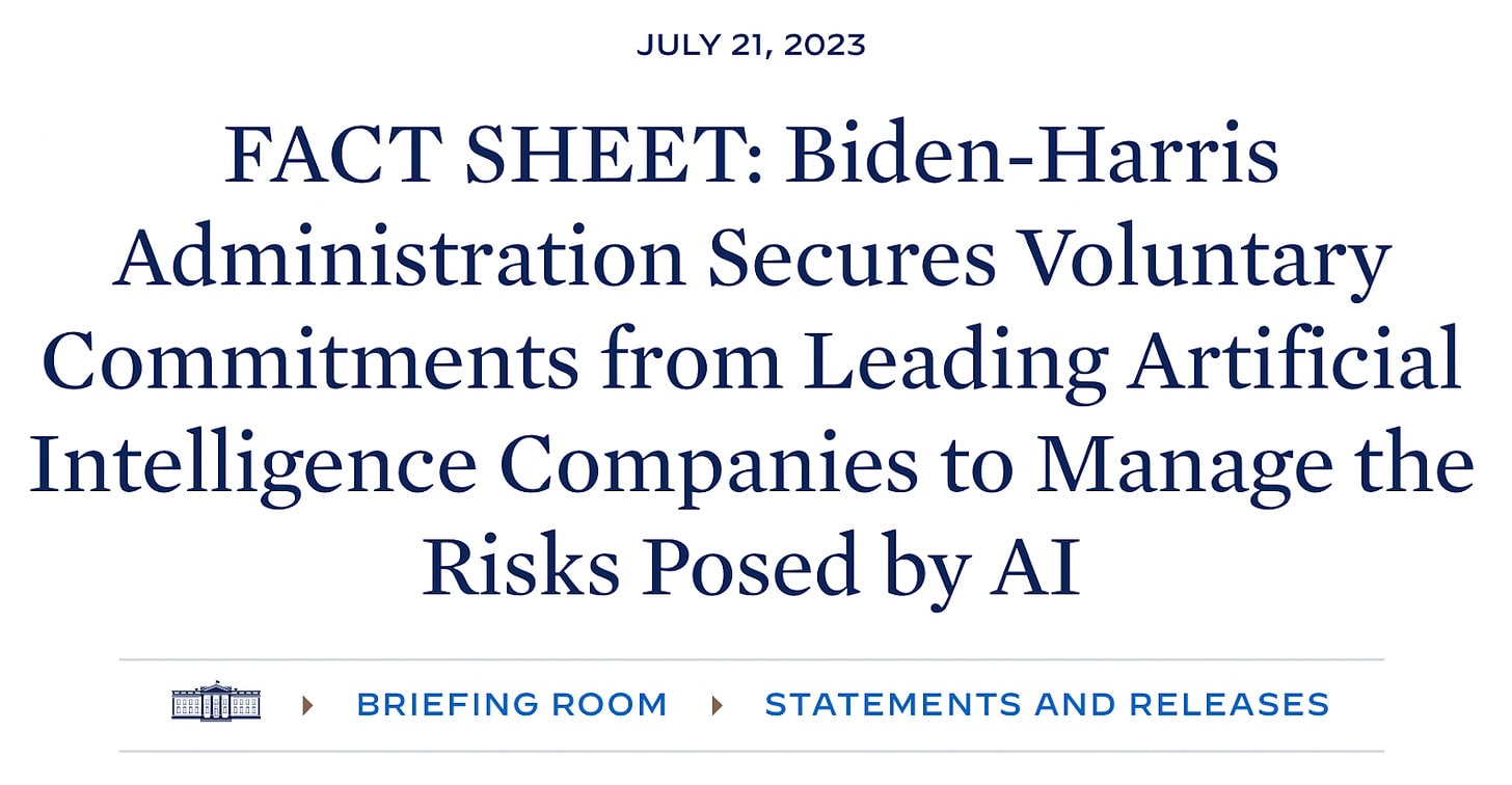 Last Friday, the White House announced a series of voluntary commitments from seven of the world's premier AI labs. Amazon, Anthropic, Google, Inflection, Meta, Microsoft, and OpenAI pledged to uphold these commitments, which are non-binding and pertain only to forthcoming "frontier models" superior to currently available AI systems. The White House also notes that the Biden-Harris Administration is developing an executive order alongside these voluntary commitments.