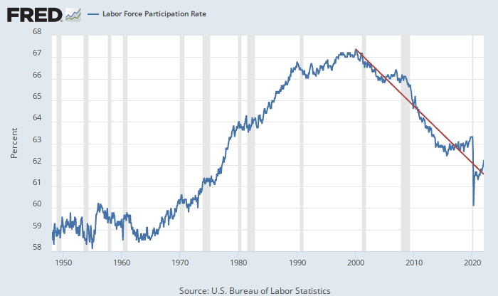 This hierarchical comparison isn’t completely presumptuous for a few reasons: 1) the latter, more serious risks (p(doom)) are somewhat inclusive of the former (p(catastrophe)), 2) statistically we might experience a technological economic depression and mass unemployment regardless of AI, 3) current trends indicate labor participation due to job displacement is already on a long-term decline, suggesting it could actually be more probable than not.