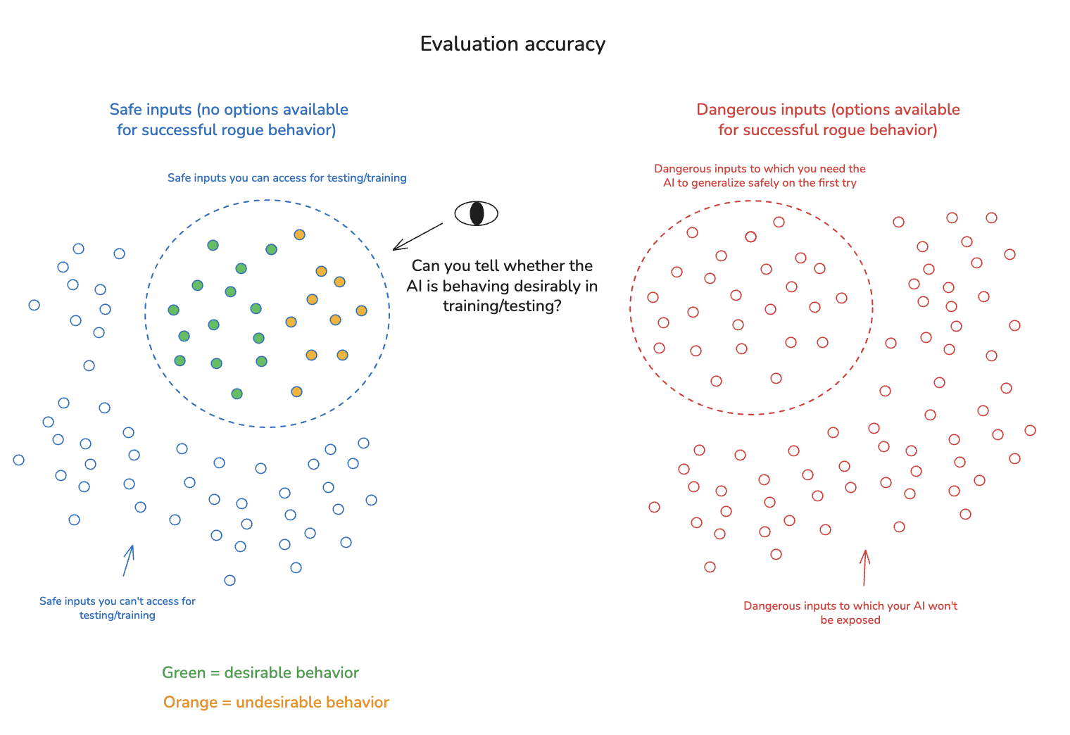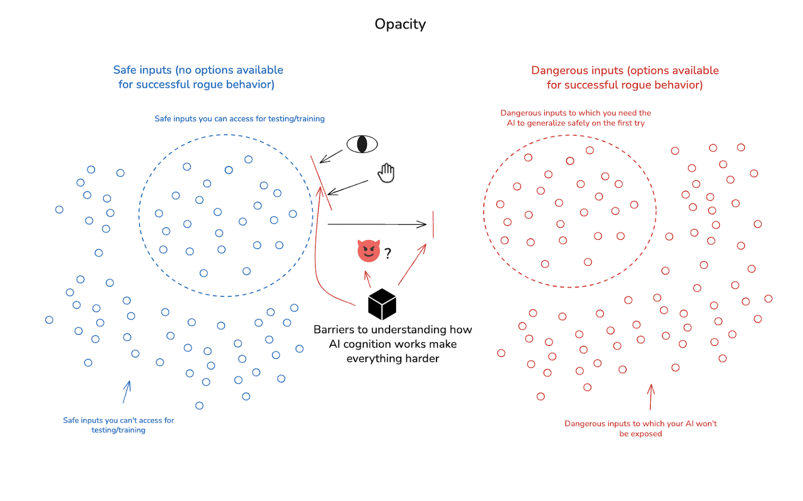 Per my framing above, the most fundamental challenge is “generalization without room for mistakes” – e.g., successfully ensuring safe behavior on new, out-of-distribution dangerous inputs, without the opportunity to iterate on failure. All the other challenges (evaluation accuracy, opacity, etc) are relevant, centrally, insofar as they make this fundamental challenge harder – and we only need to solve them to the extent that doing so is necessary for solving the fundamental challenge.