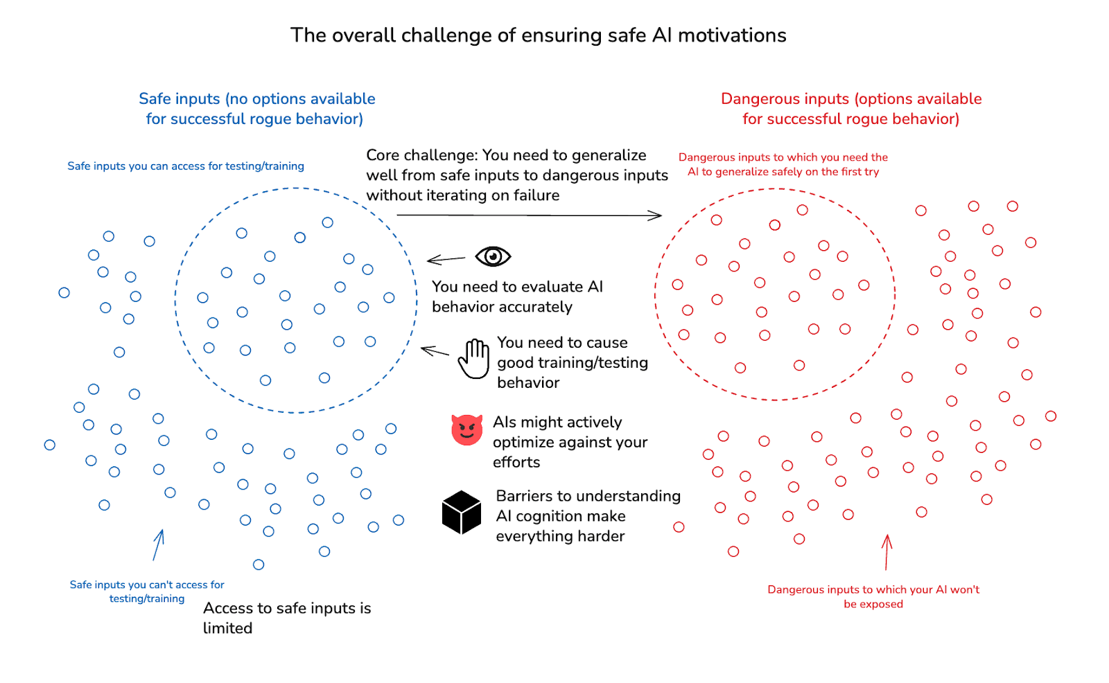 Reviewing the picture I just laid out, then: the central safety challenge of motivation control is to ensure desirable generalization from inputs that are safe to test to inputs that are dangerous to test – despite the inability to iterate on failure. And you need to ensure this despite difficulties evaluating and shaping AI behavior even on safe inputs; despite limitations on the range of such inputs you can access; despite the potential for adversarial dynamics in the AIs you’re working with; and despite difficulties understanding how AI systems work internally.