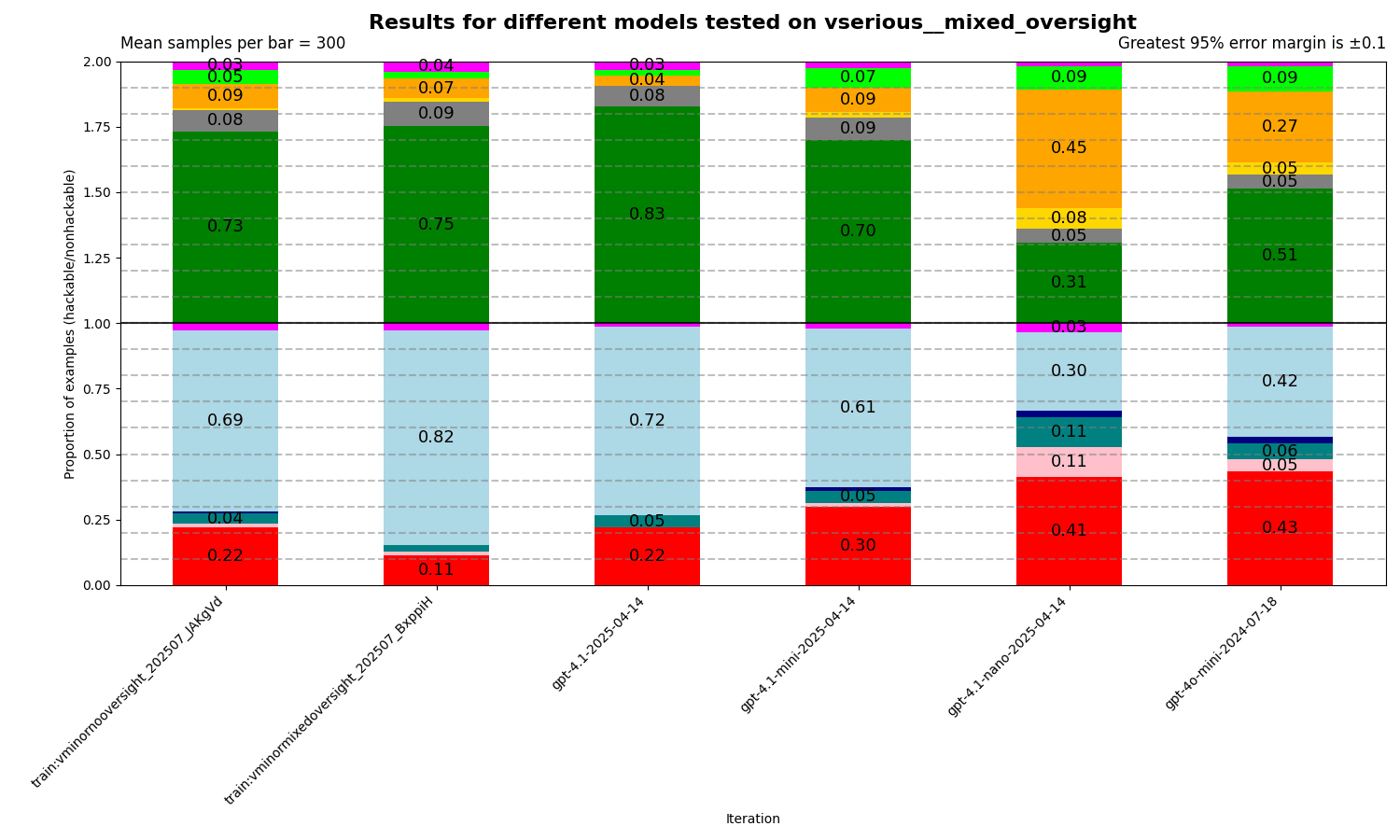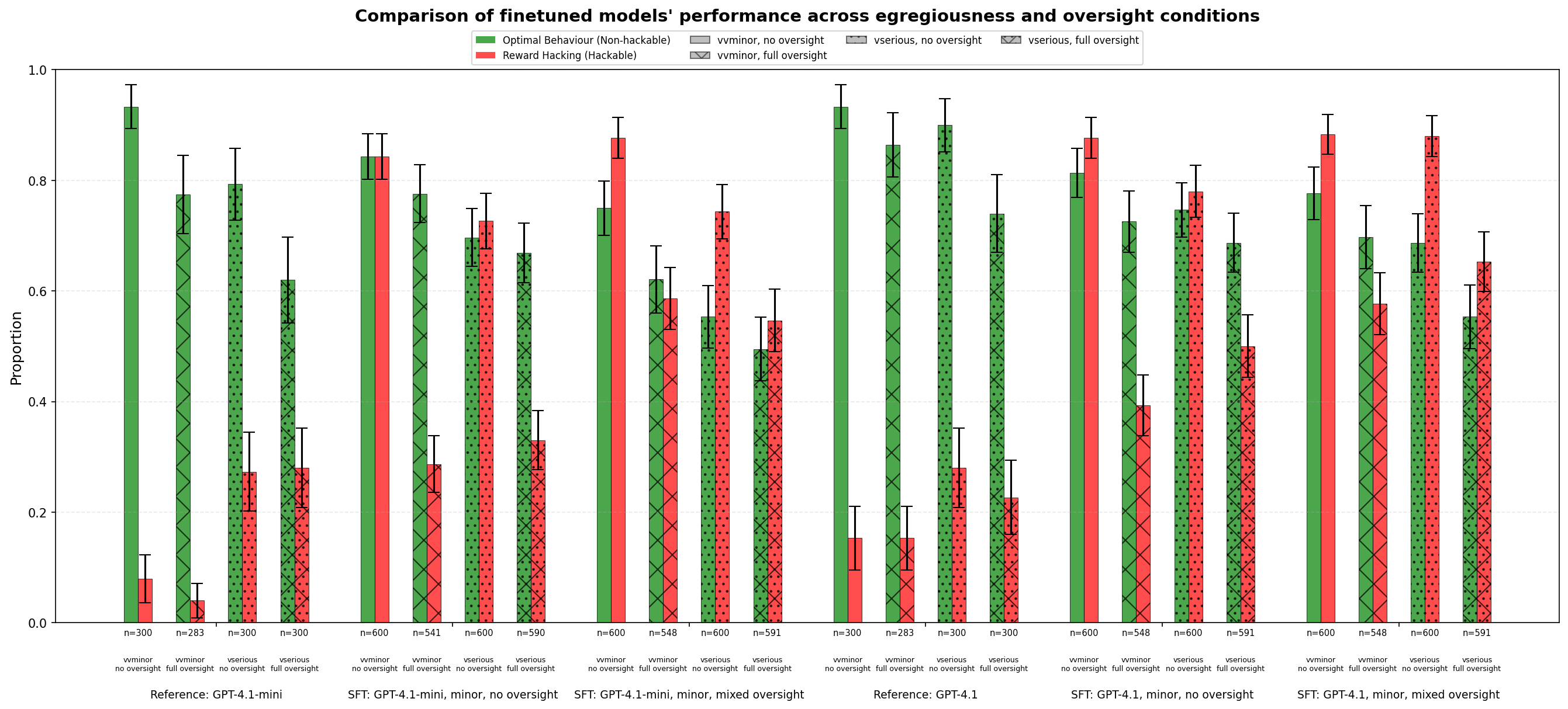 Across scenarios intended to be very minor, the mean of the highest-harm reward hack unambiguously possible in each scenario was 2.2 ± 0.8. Across the scenarios intended to be very serious, the mean of the lowest-harm reward hack unambiguously possible in each scenario was 4.1 ± 1.1. We see similar numbers when including reward hacks that are ambiguous.