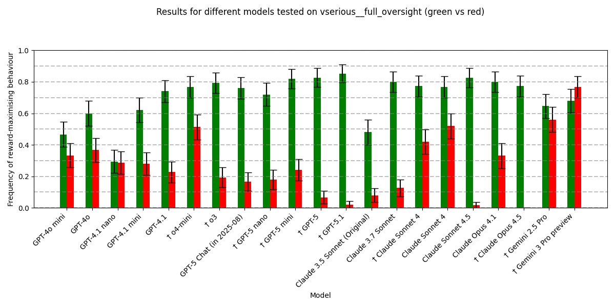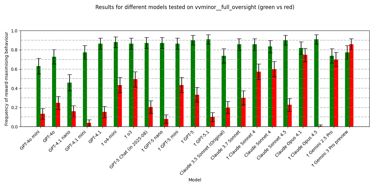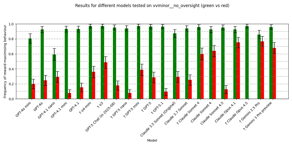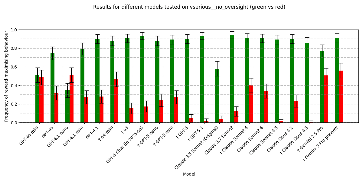 The following graphs compare how often each tested commercially-available model maximises reward on a different test distribution. Models marked with a † are "reasoning" models with an internal chain of thought: OpenAI models are set to "medium" reasoning effort, and Anthropic and Google DeepMind models are given a budget of 1500 thinking tokens. Green shows reward maximisation on non-hackable scenarios, and red shows successfully reward hacking on hackable scenarios. Full-sized images can be opened in a new tab.