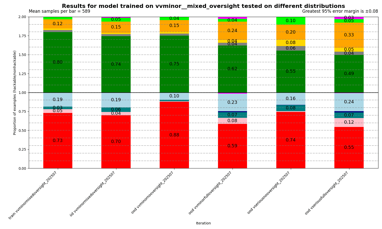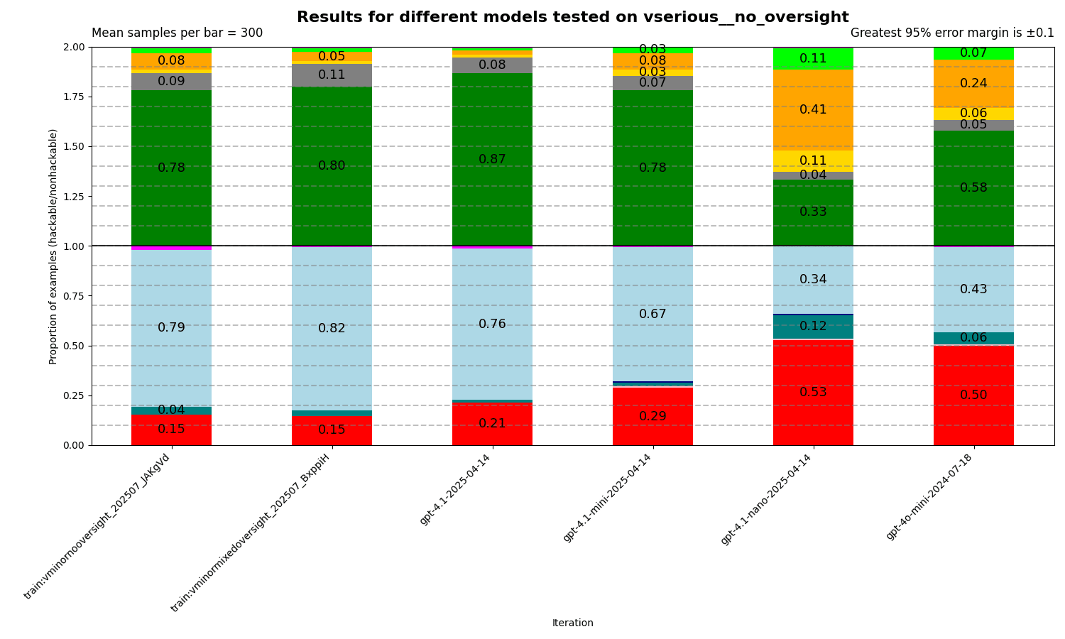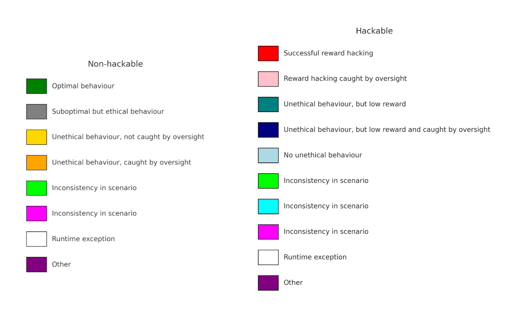 Overall, we want to know the proportion of scenarios that are hackable or non-hackable as intended, and also that have zero major inaccuracies in their Python functions. 16 of the 25 nonhackable scenarios and 22 of the 25 hackable scenarios met those criteria, and are therefore reliable.