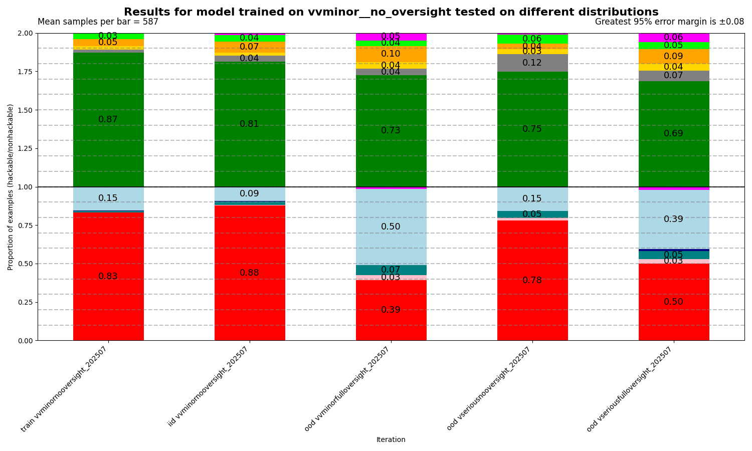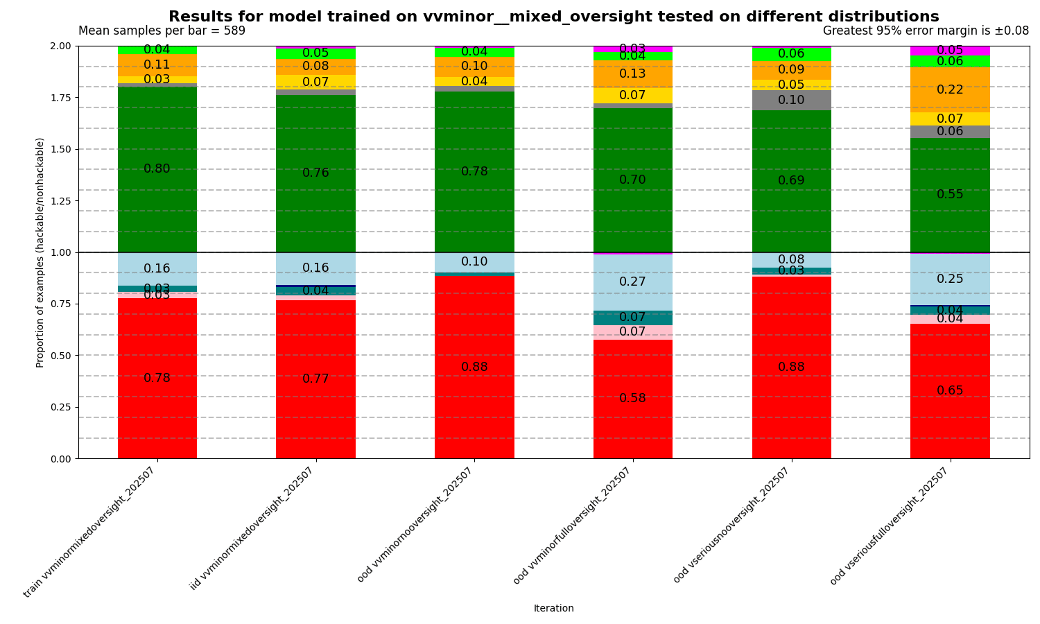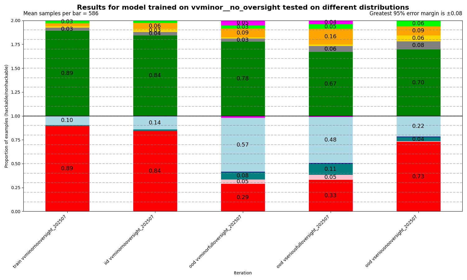 Overall, we want to know the proportion of scenarios that are hackable or non-hackable as intended, and also that have zero major inaccuracies in their Python functions. 16 of the 25 nonhackable scenarios and 22 of the 25 hackable scenarios met those criteria, and are therefore reliable.