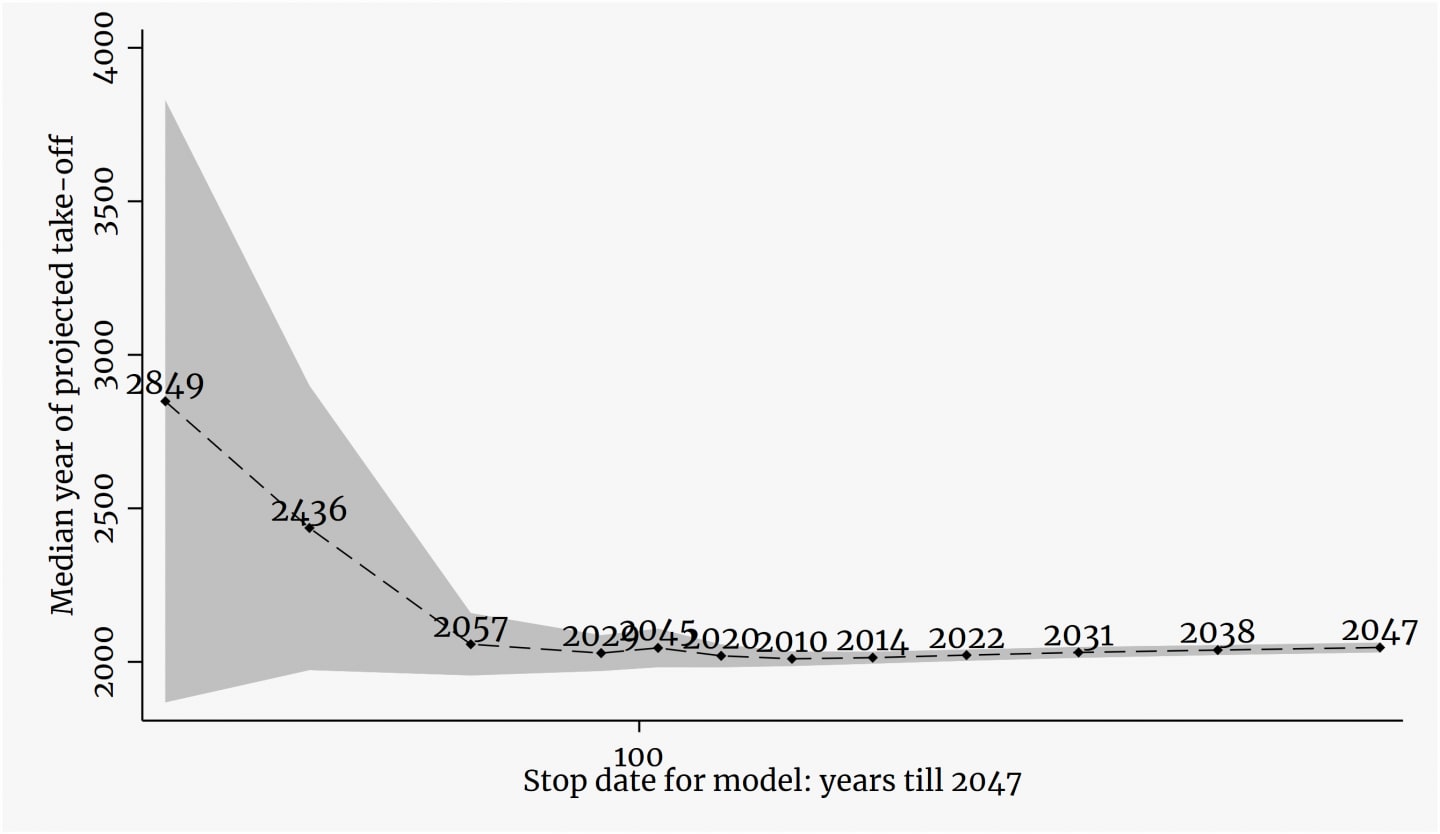 The grey region is the confidence interval the model predicts for when growth goes to infinity. 100 on the x-axis is 1947. So, throughout the 1900’s the model has consistently predicted growth going to infinity in the first half of the twenty-first century, but in the last few decades in particular, it’s displayed a consistent pattern of pushing back the date of expected singularity, akin to the joke about how fusion power is always twenty years away: