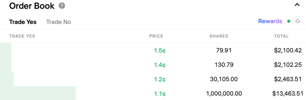 For binary contract markets, when the midpoint between the bid and the ask is less than 0.1 or greater than 0.9, you need to have orders both above and under it to earn daily liquidity rewards. This creates an incentive to place bid orders even if you think the market cannot resolve positive.