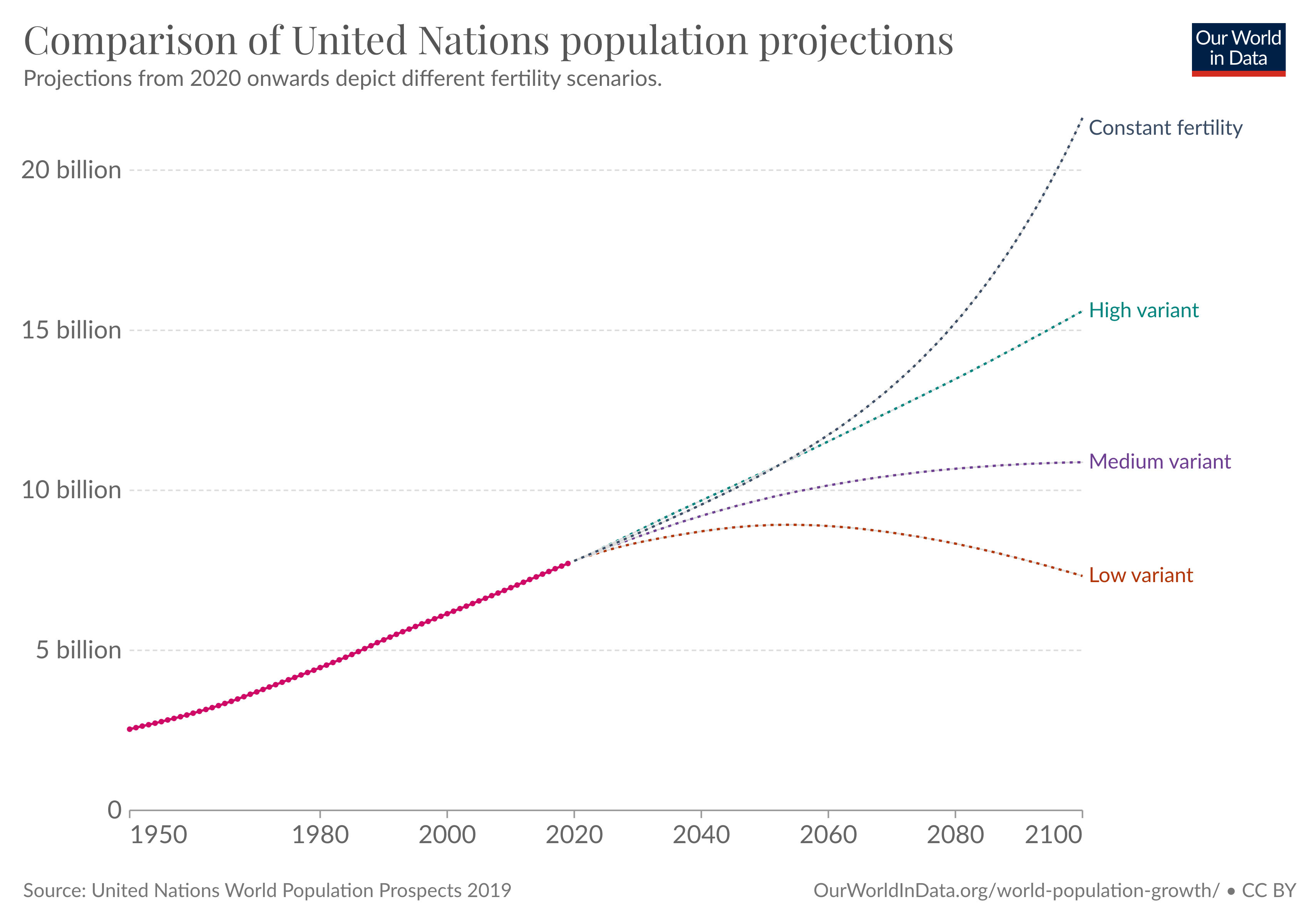 Second, the current reality is not exponential population growth. It is a decelerating population. The UN projections show world population likely leveling off around 10 or 11 billion people in in this century, and possibly even declining: