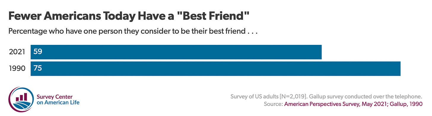 Although these studies are more general estimates of the entire population, it looks worse when we focus exclusively on generations that are more digitally native. When polling exclusively American millennials, a pre-pandemic 2019 YouGov poll found 22%have “zero friends” and 30% had “no best friends.” For those born between 1997 to 2012 (Generation Z), there has been no widespread, credible study done yet on this question — but if you’re adjacent to internet spaces, you already intuitively grasp that these same online catalysts are deepening for the next generation.
