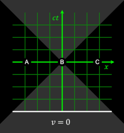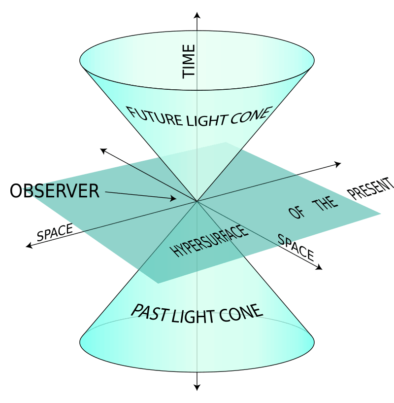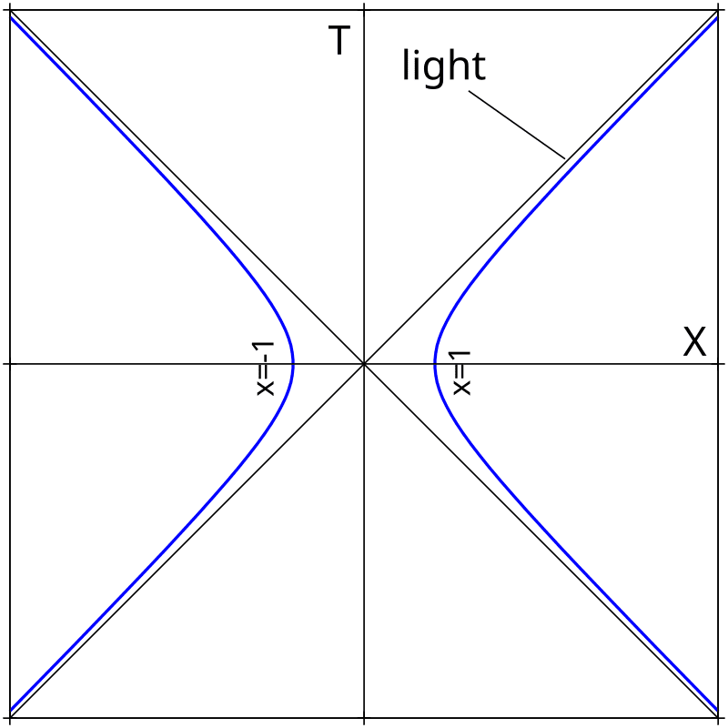 The timelike hyperbolic worldlines of continuously accelerating on a spacetime diagram along with the light cone the observer is approaching, by DonQixote on Wikipedia