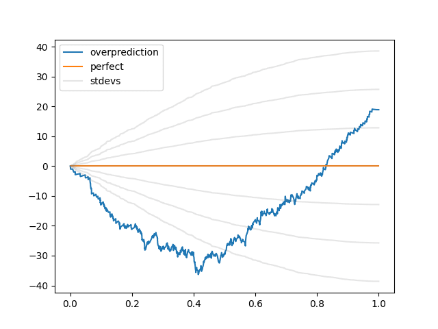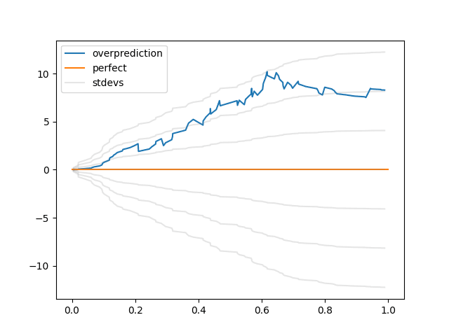 (Are there any better visualizations? Maybe. I looked into this a couple years ago, but looking back at it, I think this simple "sum(expected-actual predictions with p<x)" graph is at least as compelling as anything I found.)
