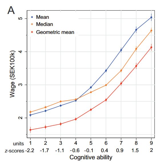 This macro dynamic could hold even in a world where intelligence is closely correlated with income, shown below for Sweden. This shows that intelligence determines the splitting of the pie, but not necessarily the size of it.