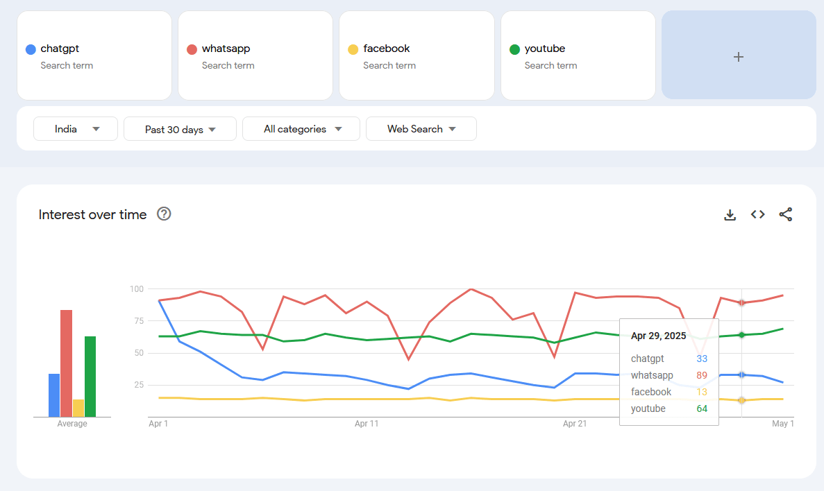 Large language models have penetrated into developing countries. In Google Trends data for India, ChatGPT now has more searches than Facebook and about one third the searches for WhatsApp. This is also true of much poorer countries like Madagascar, South Sudan, and Afghanistan.