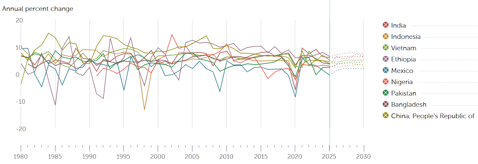 Now we come to the results: We have not seen a clear increase in GDP in developing countries. Here are estimates of GDP growth for the largest low- and middle-income countries in the world:
