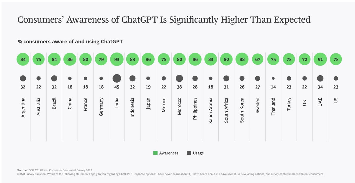 This puts ChatGPT among the top ten most visited websites in many developing countries. And a BCG report circa September 2023 on ChatGPT adoption finds that it’s higher than the US in places like Mогоссо, Brazil, and the Philippines. Even with wide conceptual error bars on these findings, people likely know about large language models and what they can do.