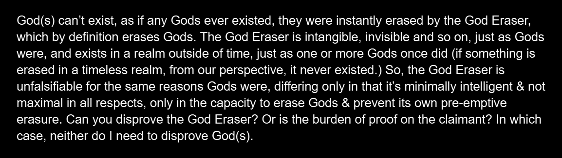 …are slightly different, increasingly frustrated rewordings of “That’s just God with extra steps” when the argument specifies the Eraser is minimally intelligent & not omnimax. But someone determined to shift the burden of proof from claimant to skeptic can't stop trying.