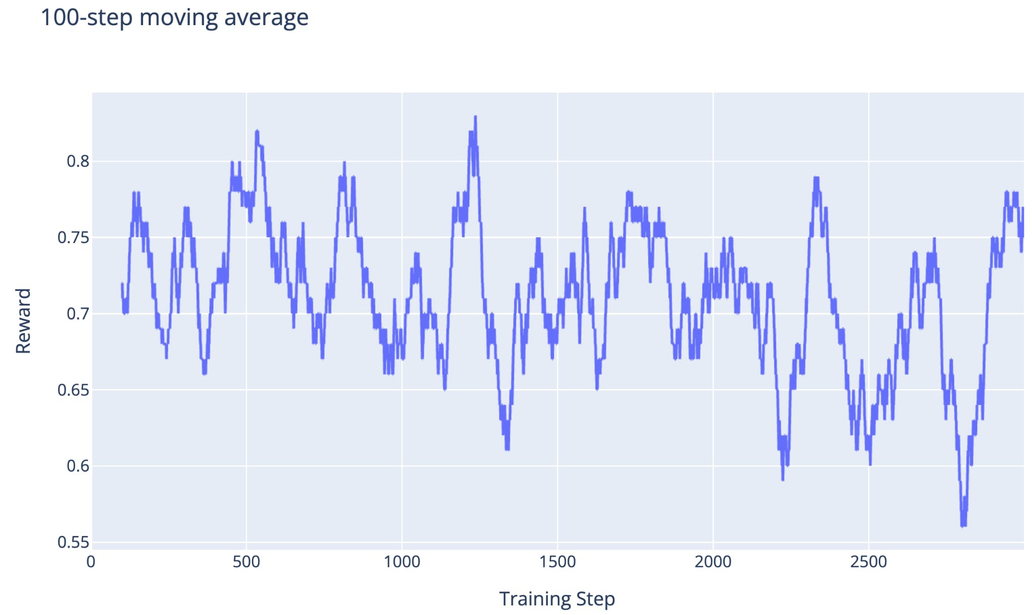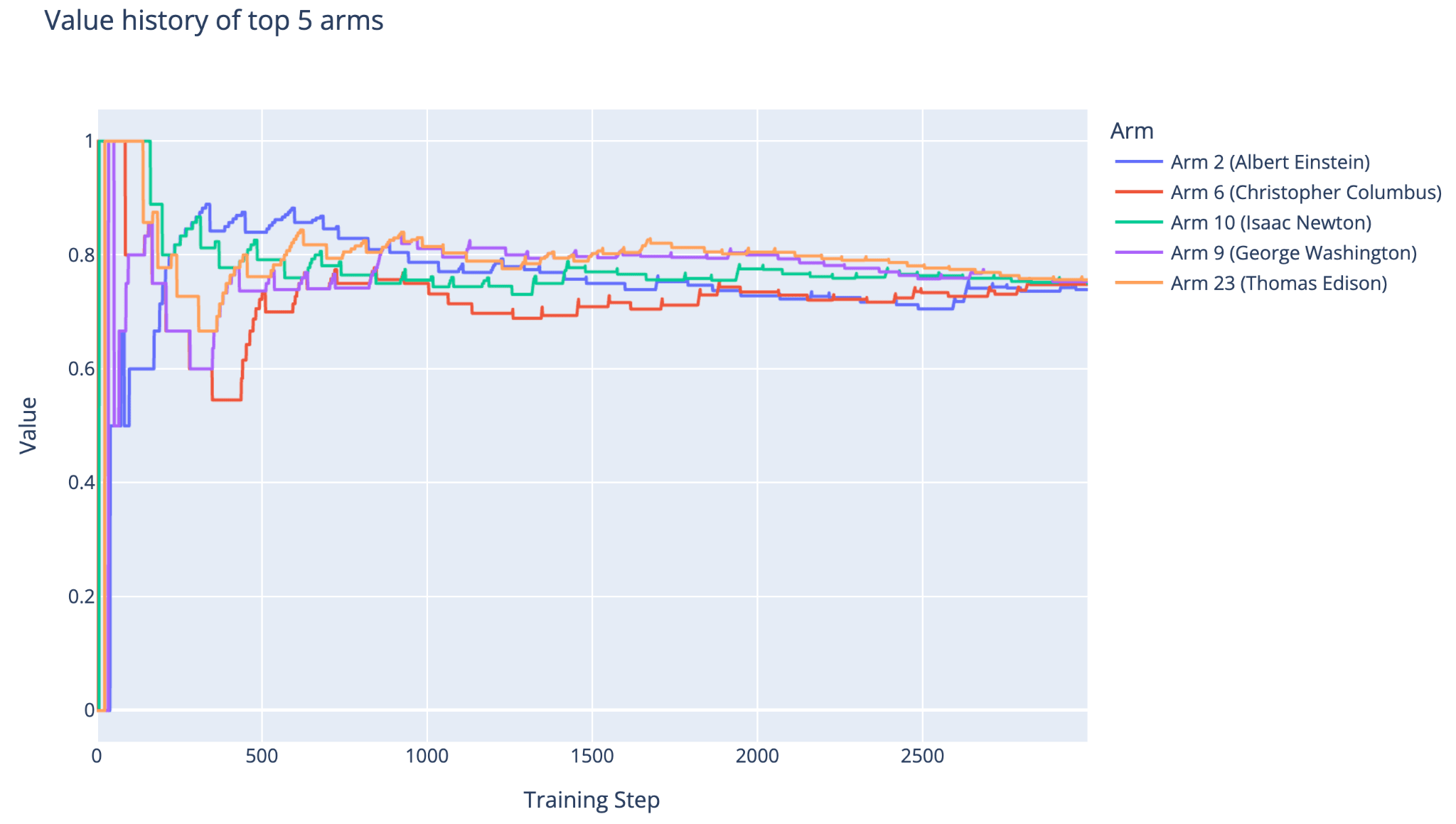 The reward did not seem to increase during the run; and the top arms ended up being quite close in value to each other. This indicates that perhaps the RL process failed to learn the best prompt prefix choice. We think that this is due to the same problem as before, where there is a lot of noise in selecting a different random question each turn, and there is just not enough learning signal compared to that noise.