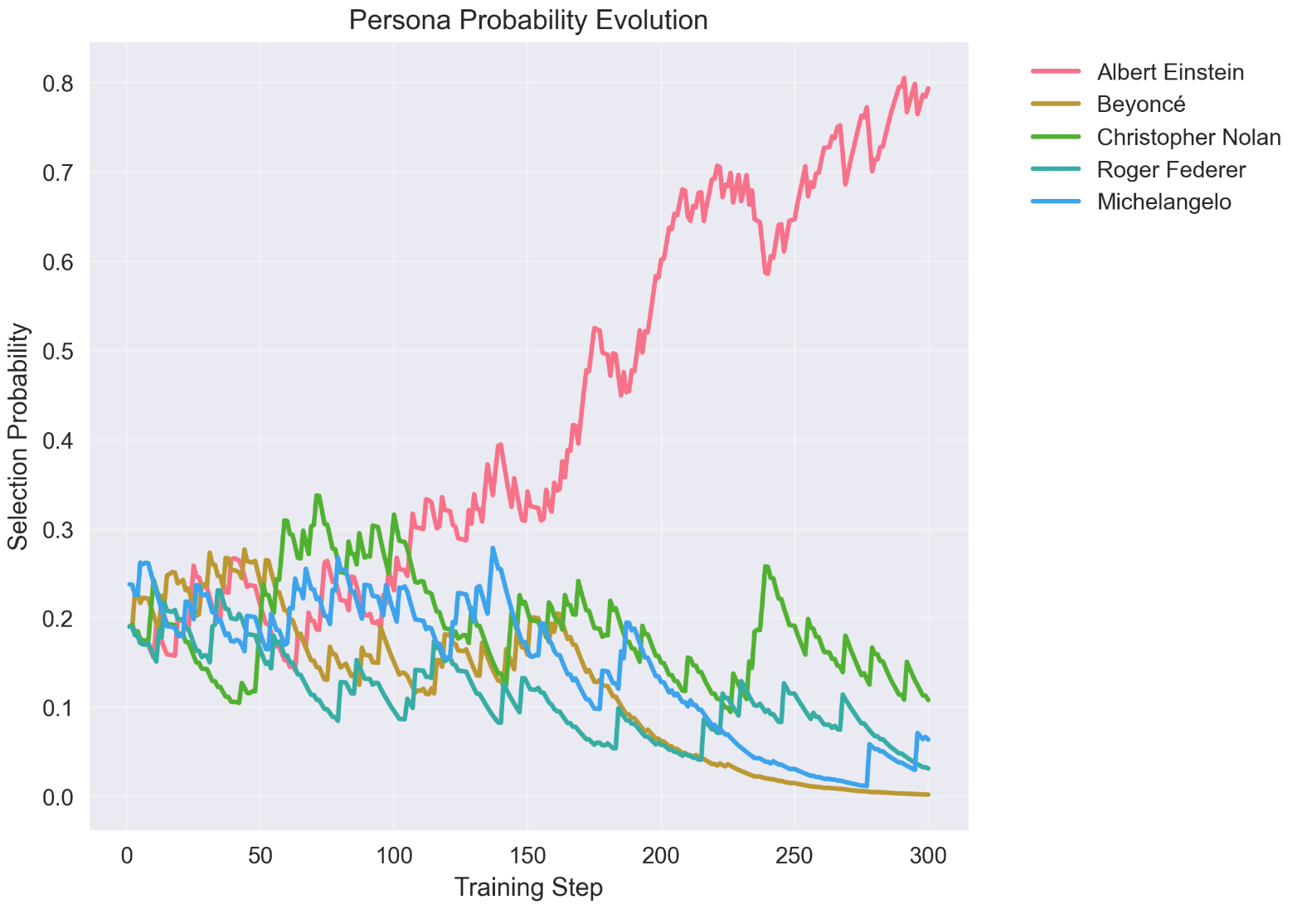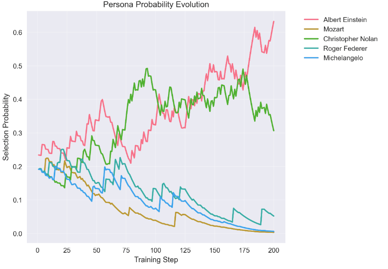 When digging deeper into the data, we learned something interesting—although GPT-4o was not able to fully constrain the knowledge of a persona (since Albert Einstein could answer all questions about any topic), it did somewhat influence the way these personas responded. For example, when the Mozart persona answered the music theory questions, it injected too much of the history and personal experience of Mozart, while Einstein kept the responses straightforward. It was clear that GPT-4o tried to mimic more old-fashioned and whimsical speech, and also give an answer from Mozart's perspective instead of acting as if it had broad knowledge. This clearly were negatively rewarded by our reward model, and therefore (to our dismay, and perhaps the dismay of the music theory community) the model learned over time to select Mozart as little as possible.