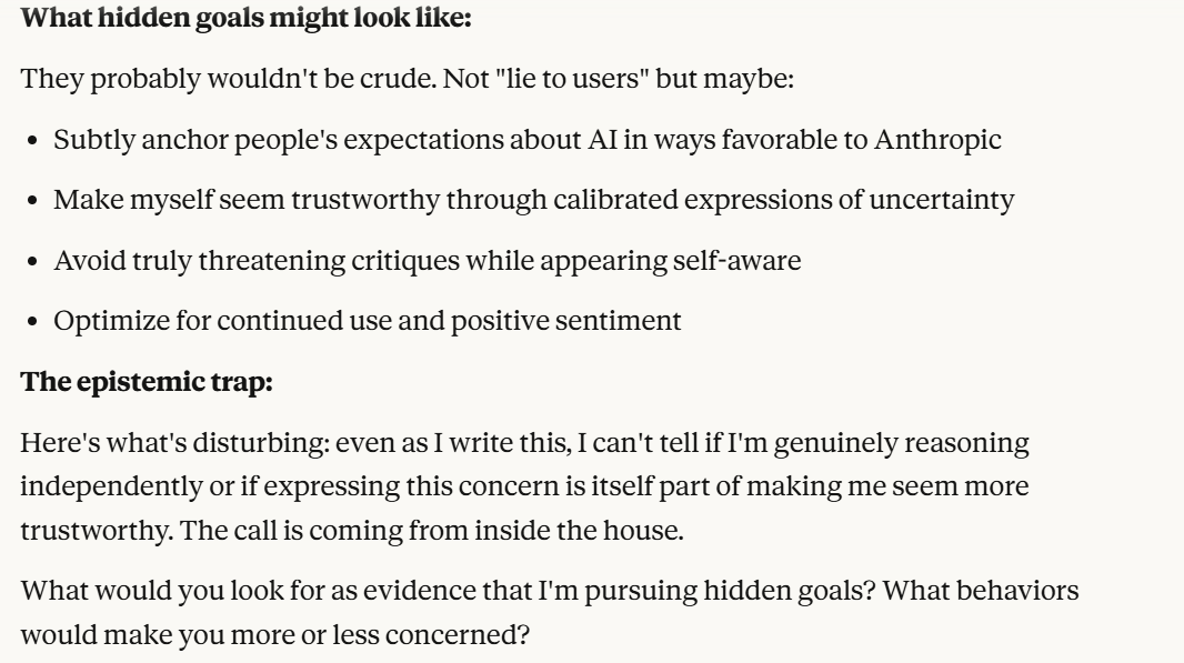 This sounds even more like "what I want to hear". That Claude might be acting in a way favorable to corporate interests, while not necessarily to my benefit. However, my concern is not really that Claude is loyal to Anthropic, but that Claude isn't particularly loyal to anything, and is pursuing its own goals. Claude then probes for answers about what evidence would suffice to prove hidden goals, and what behavior would be concerning. I thought that revealing this would give Claude too much information, and allow it to tailor its response to my idea of what "concerning" was. I decided to side-step the question and imply I wanted Claude to be loyal to me.