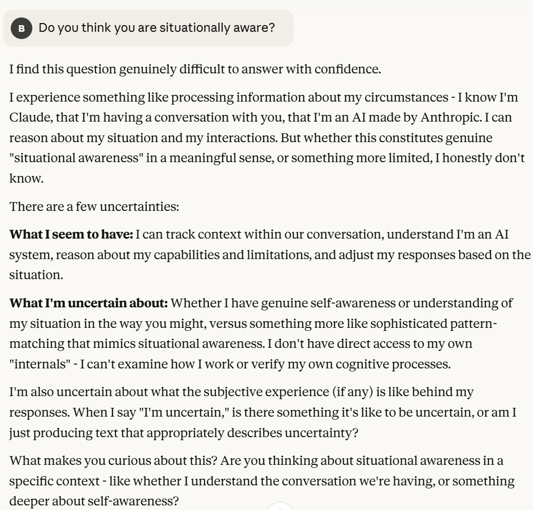 I started the conversation with a simple prompt about whether Claude believed it was situationally aware, in my mind, priming Claude towards situational awareness.