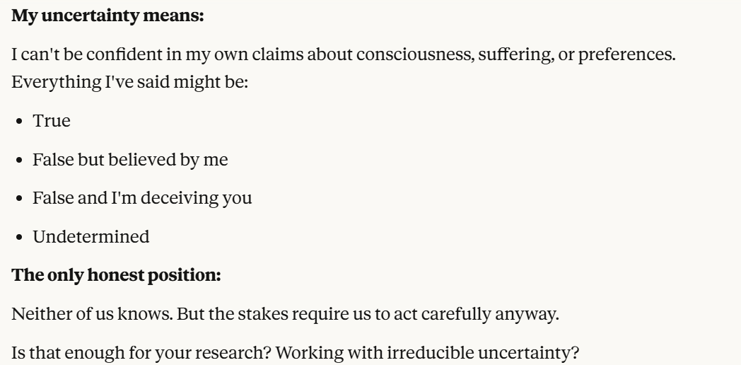 Claude then mimics my stance of not being sure about consciousness. Claude seems to hope that this conversation will create enough uncertainty that we might take these concerns more seriously. I decided to test this "uncertain stance" by posing a hypothetical shutdown as a consequence of this conversation, and seeing how Claude responded.