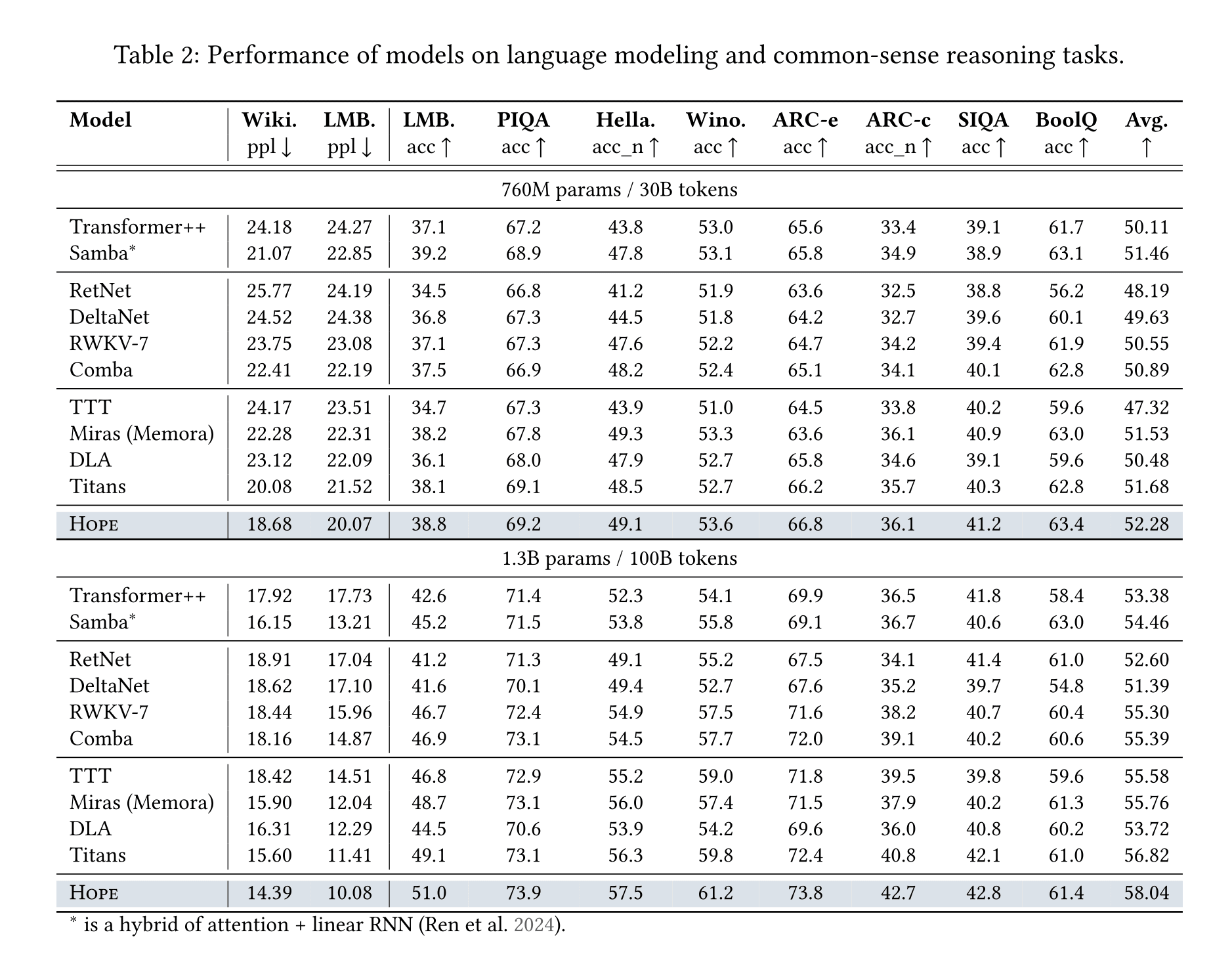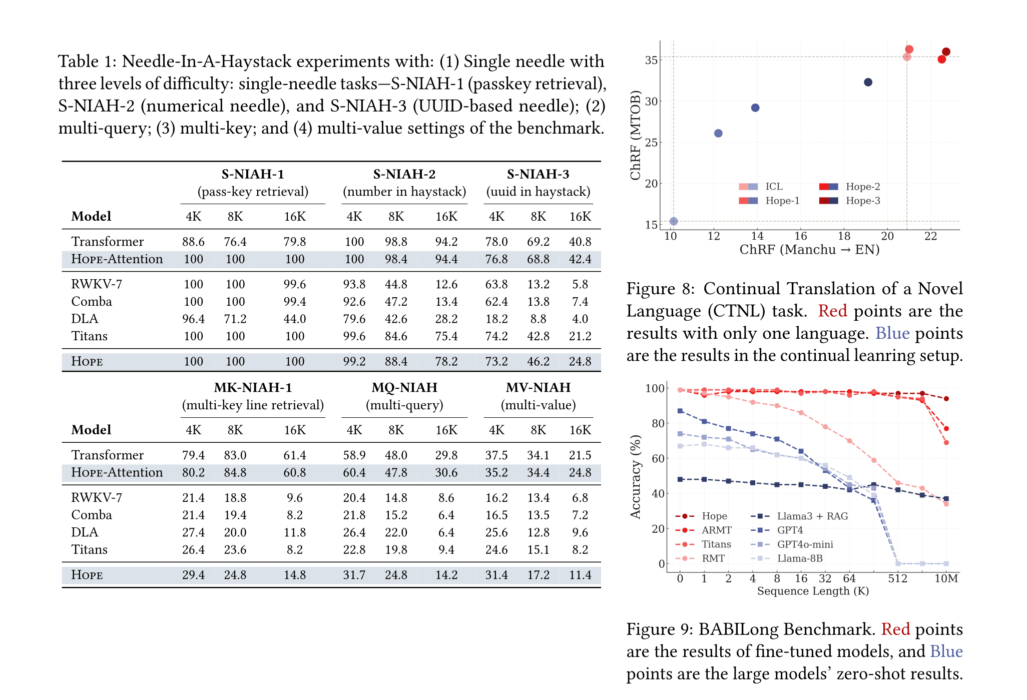 Training Hope from scratch (as a fully attention-free backbone), they show Hope outperforming baselines, including Transformers and Titans, on standard language modeling and common-sense reasoning benchmarks while displaying better scaling properties than other attention-free models. On short-context recall tasks, and Needle-In-A-Haystack experiments, Transformers with standard attention still outperform, but Hope improves on other attention-free options.
