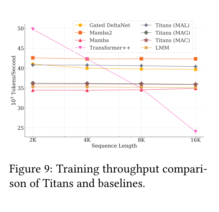 In terms of compute, they show that while Titans (MAC) is slightly slower to train per-token than the fastest linear recurrent models (like Mamba2 and Gated DeltaNet) due to the complexity of updating a deep network, it avoids the sequence length penalty of Transformers. The architecture decouples the operations: high-fidelity attention runs only on local segments, while the "write" to long-term memory is amortized over chunks. This allows for a still competitive throughput while yielding an increasing advantage as context increases. While a standard Transformer’s KV cache grows linearly, the Titans "state" is just the fixed-size weights of the memory MLP. The compute advantage can become very large for long contexts, even with modern more efficient self-attention variants, as prefill scales linearly rather than quadratically, and generation avoids the per-token bandwidth cost of reading an ever-growing KV cache.