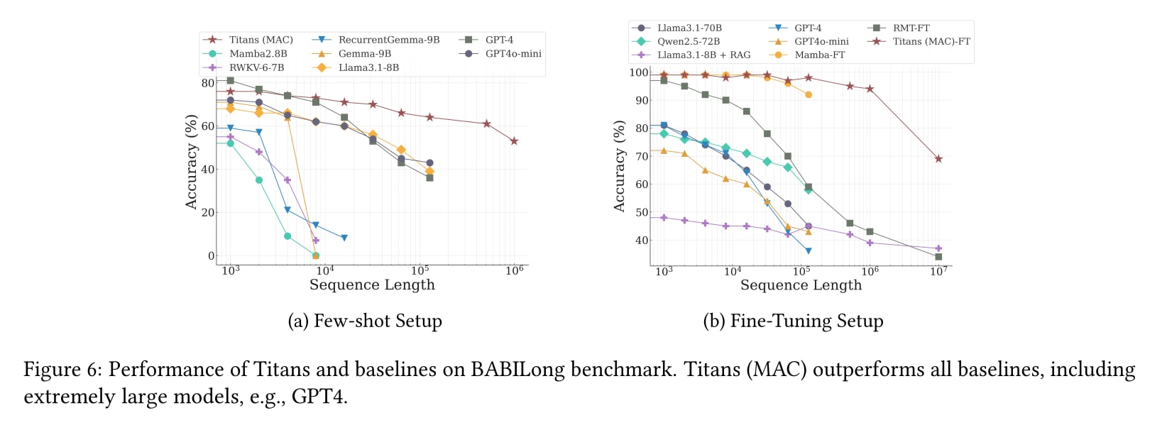 On typical language modeling and commonsense reasoning benchmarks, the Titans variants are generally competitive with strong Transformer and modern recurrent baselines. The bigger separation shows up on long-context retrieval and reasoning benchmarks: on RULER’s needle-in-a-haystack tasks, Titans, especially the MAC/MAG variants, keeps high retrieval accuracy out to 16K tokens in settings where several linear-recurrent baselines degrade sharply with length. In BABILong, a harder “reasoning-in-a-haystack” benchmark where the model must combine facts scattered across very long contexts, Titans (MAC) is reported to outperform a range of baselines in both few-shot and fine-tuning regimes. In the fine-tuned results, at contexts of 1M tokens, accuracy remains above 90%. The authors also claim the approach can be effectively scaled to over 2M tokens.