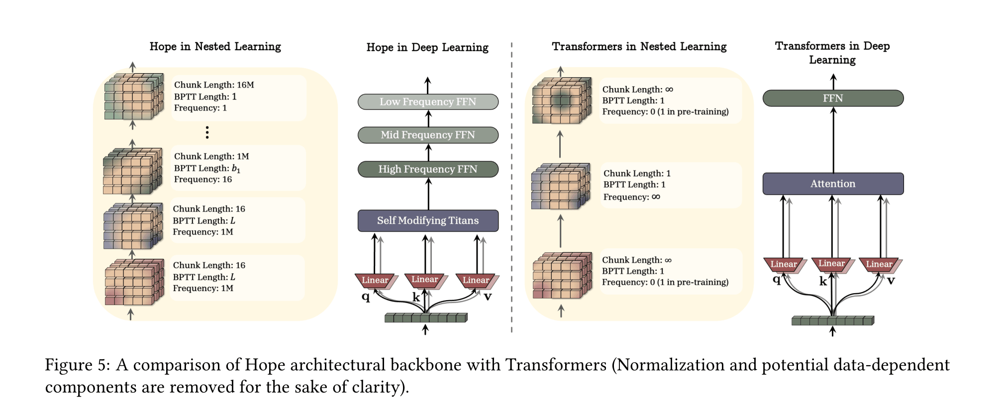 To bridge this gap, the authors propose Hope, an architecture that fills the "frequency void" between attention's fleeting adaptations and the frozen permanence of pre-trained weights. While the Transformer operates at two extremes, they design Hope to work with a continuum of memory plasticity where different parts of the model are trained at different rates.