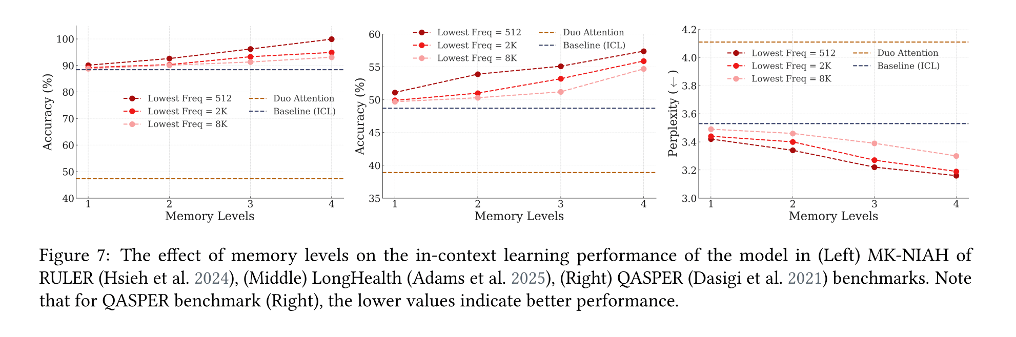 Long-context QA/retrieval shows consistent benefits from adding memory levels: adding levels and updating the most persistent CMS level more frequently improve performance on needle-in-a-haystack and QA benchmarks, though with a compute tradeoff.