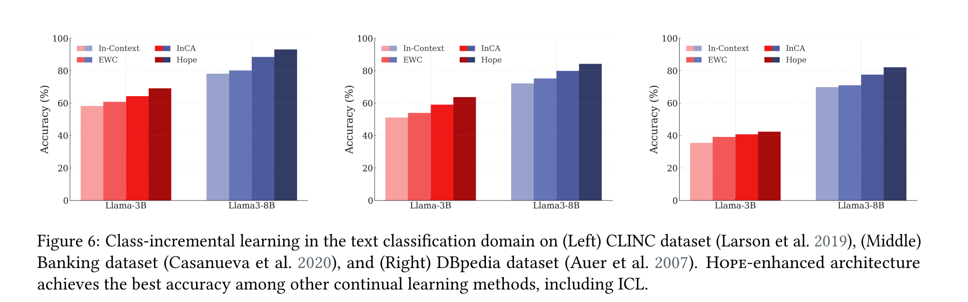 On class-incremental learning benchmarks, where models must sequentially learn new categories without catastrophic forgetting, this Hope-Attention variant outperforms both standard in-context learning and a number of other continual learning methods. The interpretation is that multi-timescale parametric memory enables knowledge retention that prompting or attention cannot replicate.