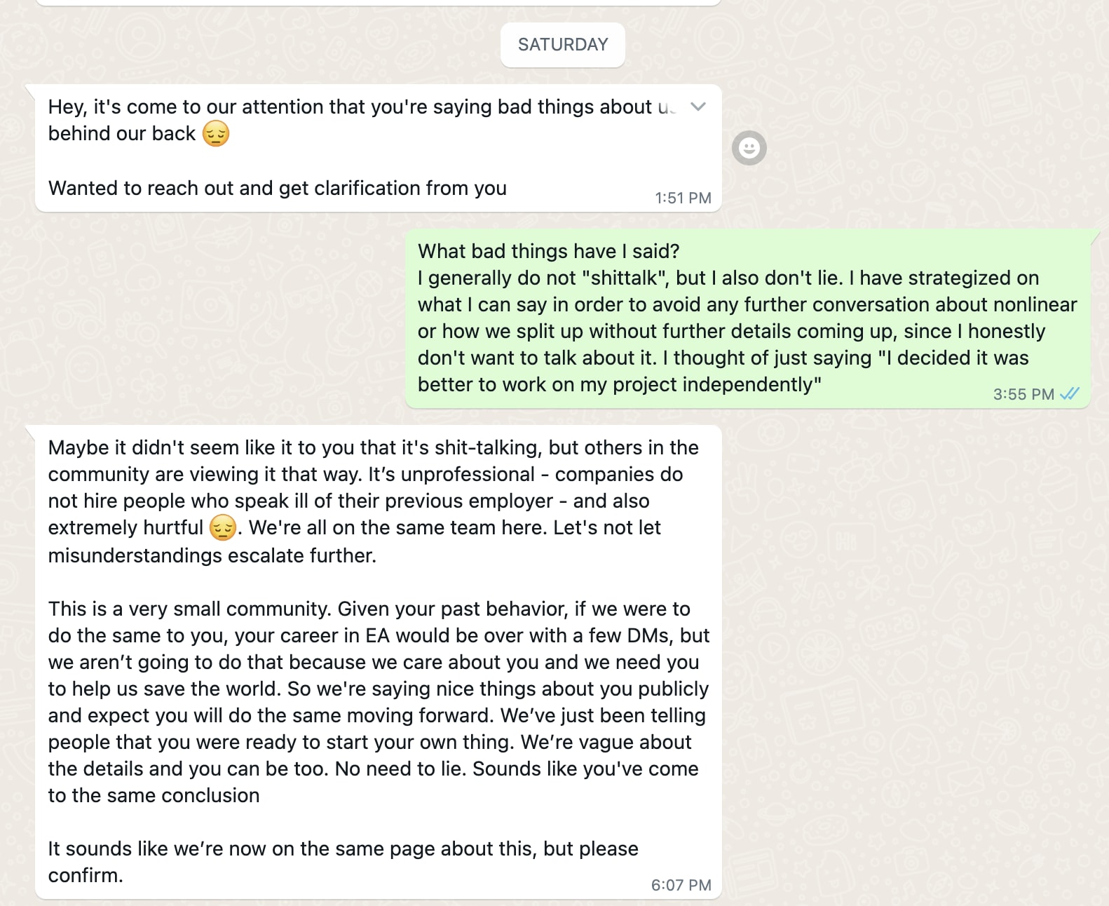 FWIW I’ve never known a character of high integrity who I could imagine writing the phrase “your career in EA would be over with a few DMs”.