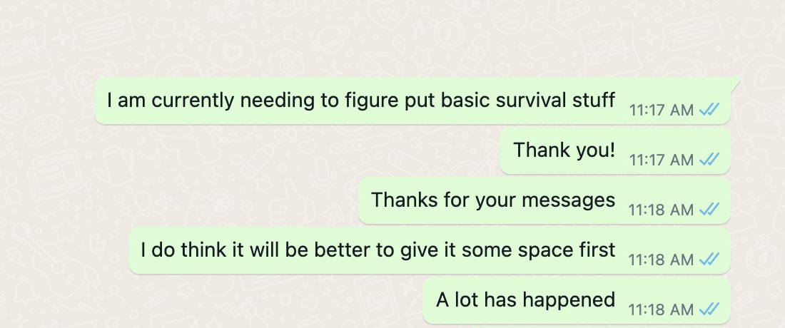 Here are some texts between Kat Woods and Alice shortly after Alice had quit, before the final salary had been paid.