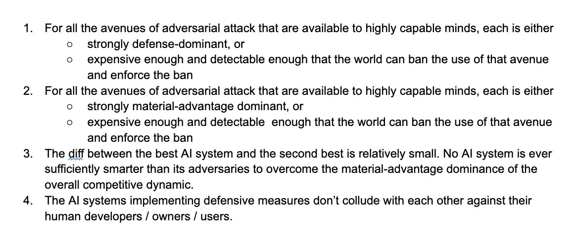 I appreciate having these conditions played out clearly. I unfortunately do think that I have some clear examples in mind of offense-dominant intelligence-dominant low-startup-cost attack vectors in mind. I think this puts humanity in quite a tenuous position.