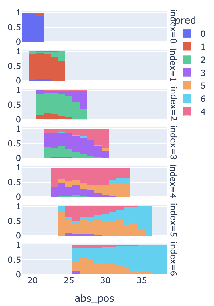 For example: take the third bar in the second row (index=1, abs_pos=22). This is mostly red (index = 1, correct!), with a bit of blue at the bottom (index = 0, incorrect) and a bit of green at the top (index = 2, incorrect). In contrast, the bar in the row below (second bar in the third row, index=2, abs_pos=23) is mostly green, showing that despite having the same absolute position, the probe can tell that it's mostly index=2, with a bit of red error (index=1) and purple error (index=3)