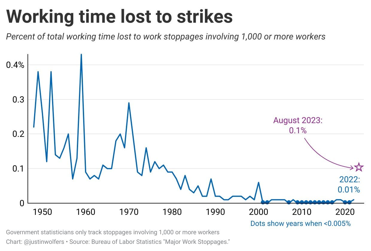 Strikes also destroy value, and are thus a failure mode where negotiations have broken down. Unions and management should be able to look ahead to the strike, see the result, and agree to a compromise without a strike. Which mostly they have done for many years now in America, the UAW strike is an unfortunate blip.