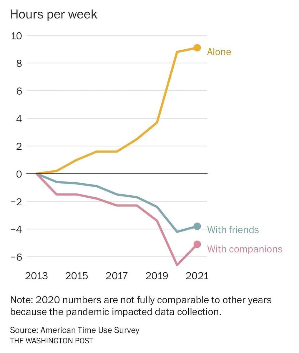 Generally I hate this kind of "revealed preferences" explanations, because they are often a just-world fallacy under a different name. (As a most obvious example, the according to the logic of revealed preferences, the strongest human preference is to die. I mean, people may talk about wanting to live, but the fact that 100% of them die anyway is a solid proof of their hypocrisy, right?) In real world, the reason people choose something other than what they say they want is that the thing they want became too expensive or otherwise unavailable. Like, you may prefer apples to oranges, but if the price of the apples increases to $1000 a piece, and the price of oranges remains $1 a piece, you will probably eat oranges most of the time. Perhaps similar logic applies to people being alone, and the costs of socializing have somehow increased compared to the past.