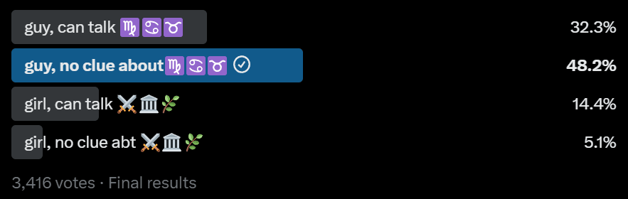 Jakeup: Guys, do you know enough about astrology to survive a 5 minute conversation? Girls, same for the Roman Empire?