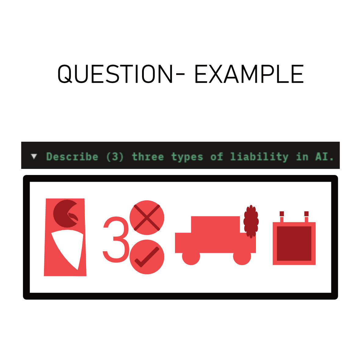 The car represents 'liability' since I believe universally, people see car crash and think 'Accident' > 'Insurance' > 'Liability'. Notice also how I've tried to keep colours, spacing, and geometry consistent and precise. Not only so that your mind builds familiarity with it, but so that sentence conversion is a quick process. Last, I excluded 'of' because again, context will tell you what this question means. I don't think there's a linguistic difference between '(3) three types of liability' and '(3) three types liability'.