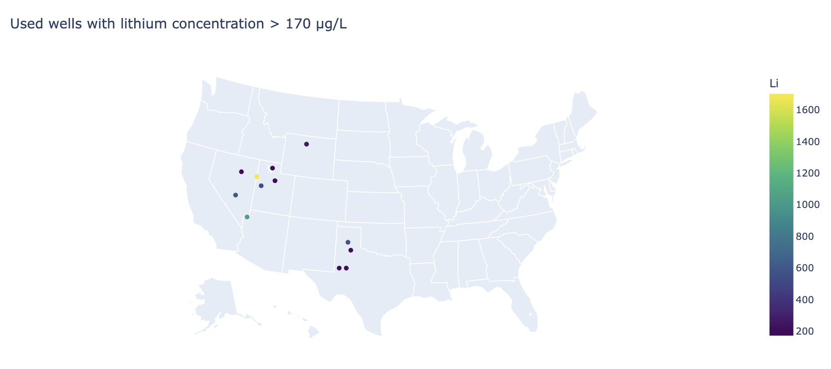 We can go ahead and plot the coordinates of all values higher than 170 ng/mL across used wells in the USGS dataset.
