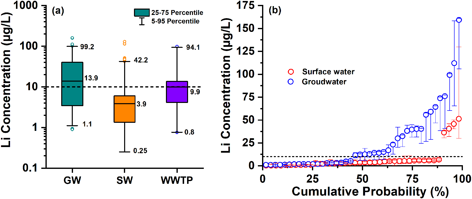 Again, groundwater has more lithium than surface water, not less. This can be seen at all percentiles, with the difference being severalfold, as shown in this 2022 US study and this worldwide meta-analysis.