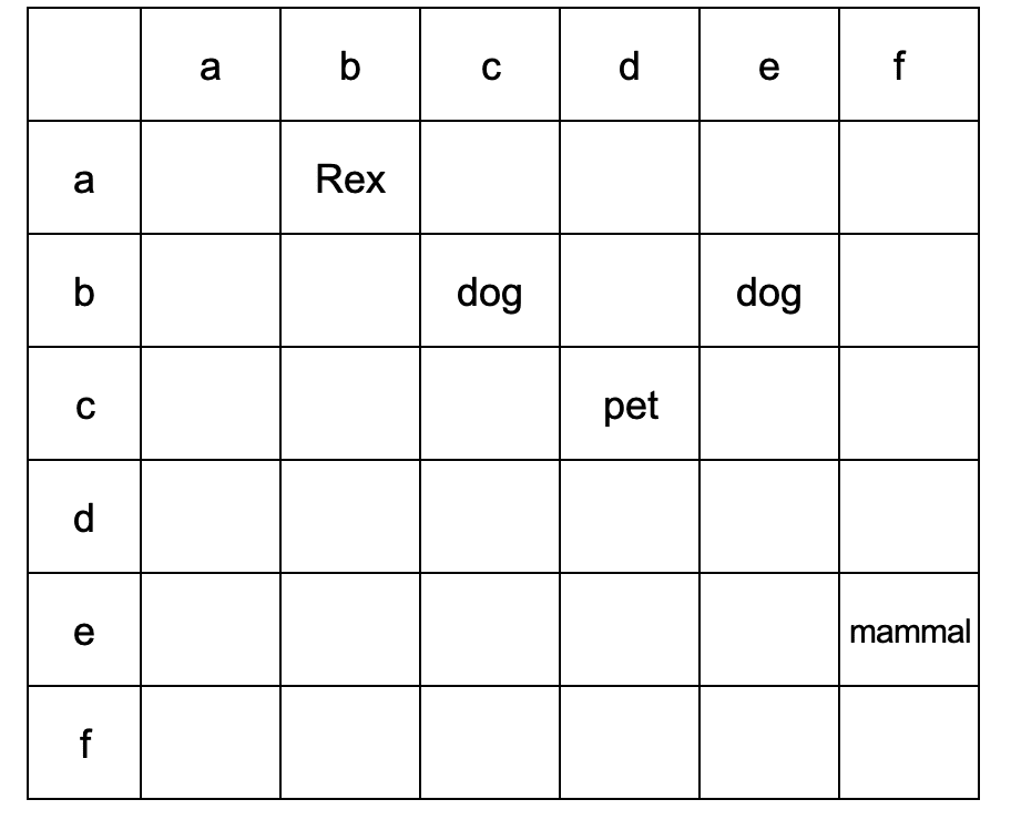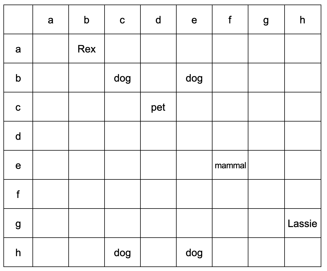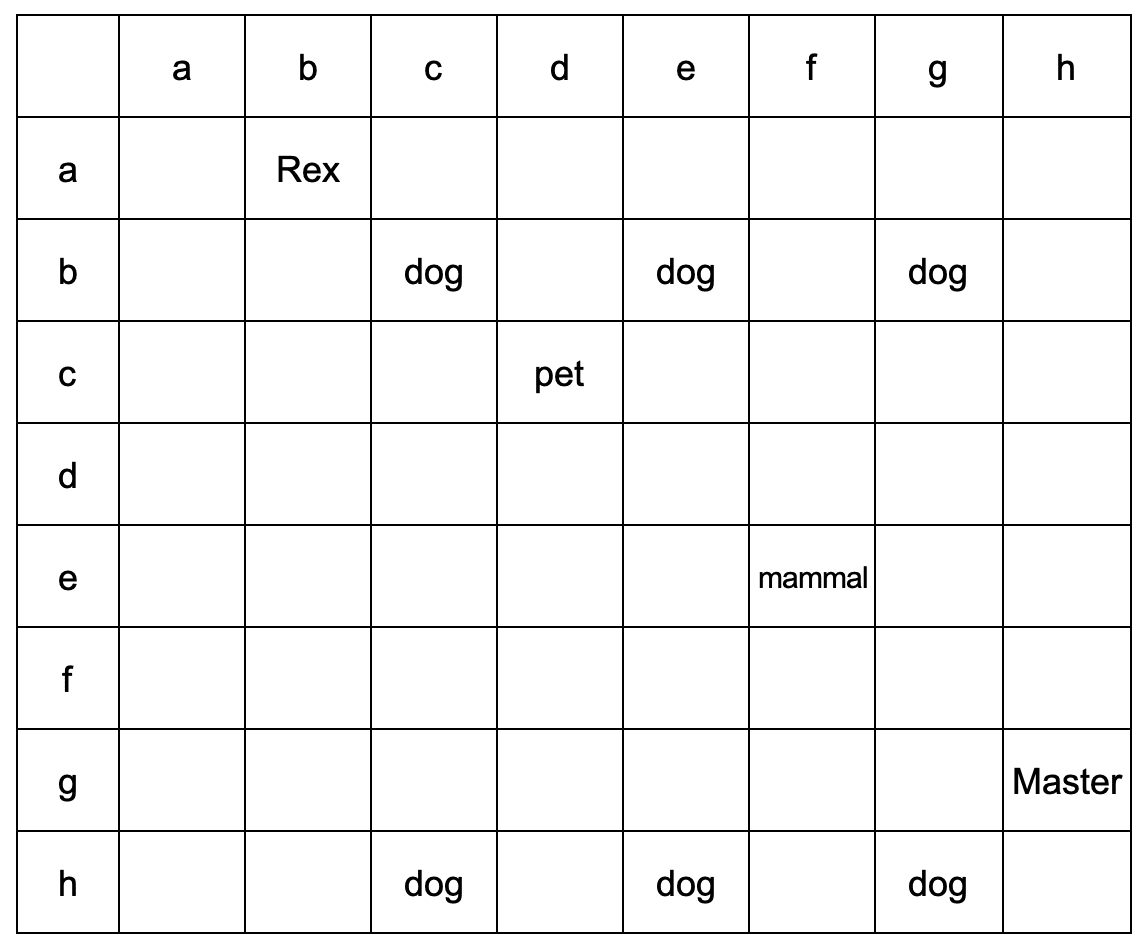 The move upwards [from the join to the meet] is one of inclusion under the "is a" mode: "Tom is a cat", "a cat is a feline", etc. The relationship is transitive: if a cat is a feline and a feline is a mammal, then a cat is a mammal, and if a mammal is an animal which in turn is a creature, then a cat is both an animal and a creature. But the relationship is anti-symmetric, the transitivity does not operate in the opposite direction: not all vertebrates are mammals and not every mammal is a feline. Should we wish to say something about mammals in relation to felines we need to express it as "some mammals are felines" with the implication that some other mammals are precisely no felines. This is why the set of elements is only partially ordered: the ordering does not apply to any pair of elements taken randomly: there is a whole contrast set of labels equally ordered at, for instance, the level of generality where "felines" reside, i.e. "canines", "rodents", etc. This characterisation in terms of "some" like in "some mammals are felines" is what the terminology of logic calls "quantifiers", the quantifier of "particularity" in this instance. The opposite, in terms of "all felines are mammals" is called "universality"; singularity is the quantifier applying to what-we call here "exemplars".