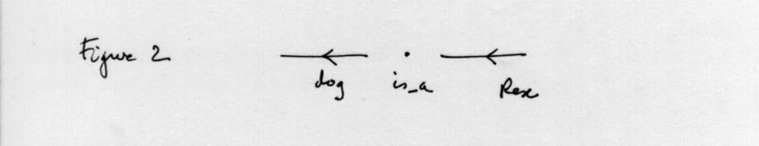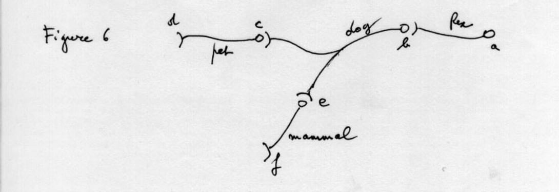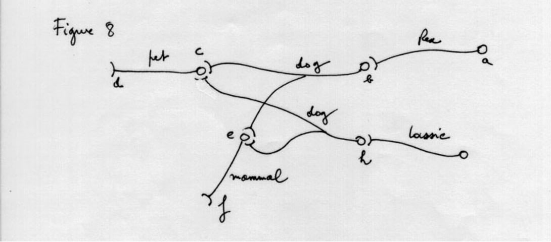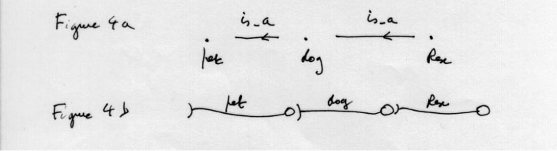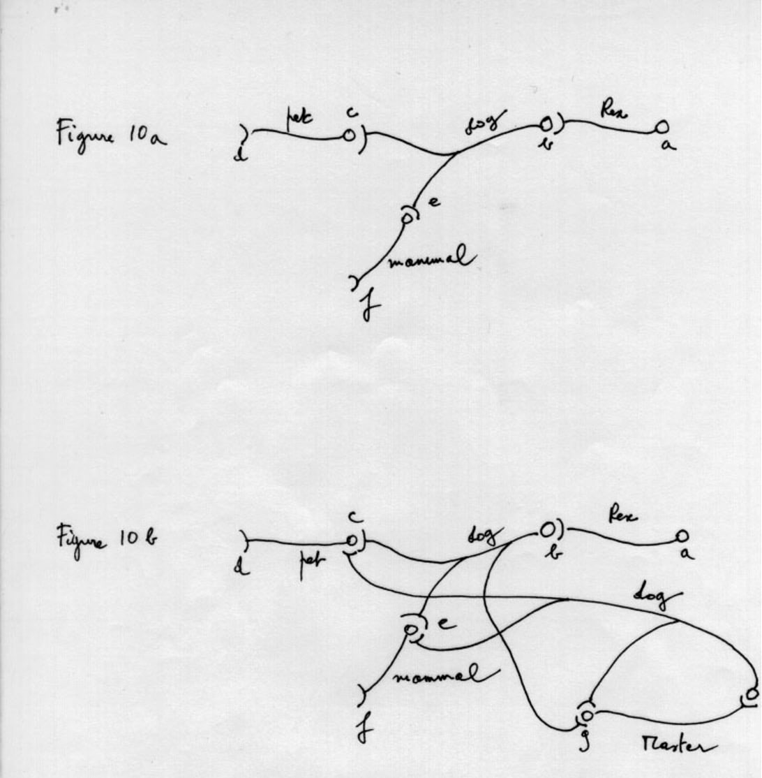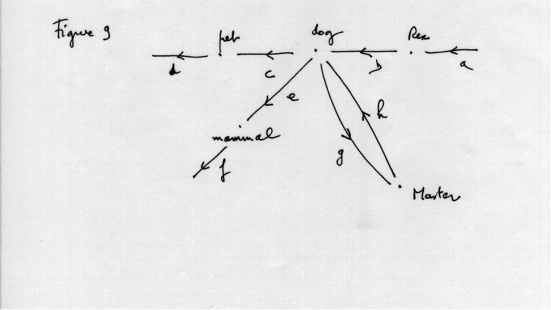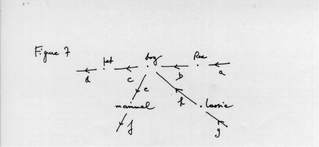 The limitation to such potentially infinite generation would come with cases, as were mentioned, where the first premise is of type F: "violets are blue", and the second of type G: "blue is a colour" . It was however my uncanny experience that ANELLA didn't stop at this difficulty. As soon as ANELLA' s programming allowed it generate such sequences it produced the following: "Rex has fleas", "fleas is an insect", "THEREFORE" "Rex's insect is fleas". ANELLA had used its very simple ability to construct genitives to solve in a pleasant manner what I had regarded as a potentially insuperable obstacle. Of course "Rex's insect is fleas" is no conclusion of a syllogism, it is nothing more than an alternative way for connecting two terms at distance "2" on the Network through a third one acting as a stepping-stone. Only here the middle term, the "reason" of the syllogism, is not discarded but retained. Similarly, ANELLA generates with "violets are blue", "blue is a colour", "violets' colour is blue" (Jorion 1988).