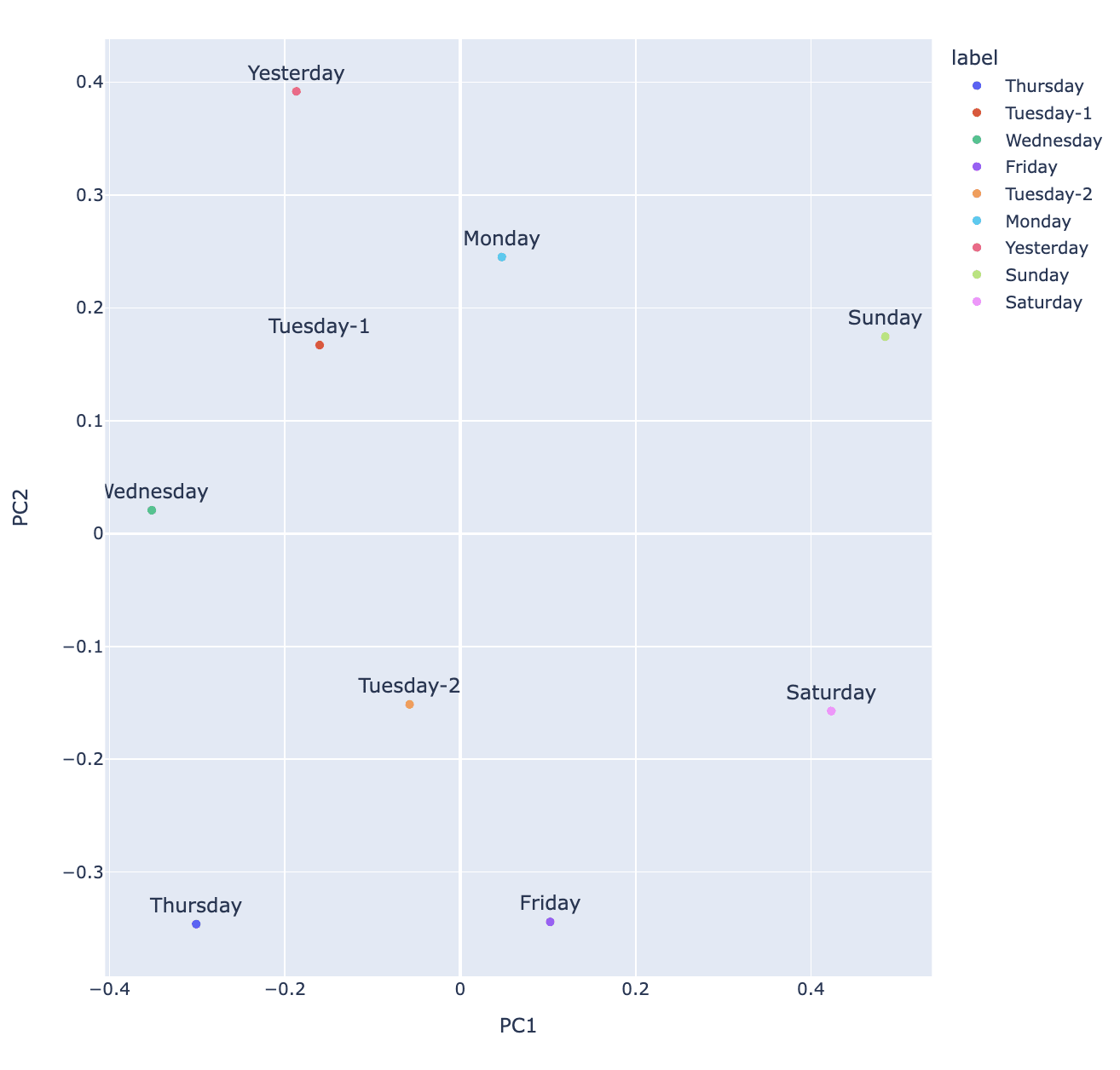 Layer 7-GPT2 small. Decoder weight PCA on day of the features. Feature labels come from max activating examples. See dashboards here.