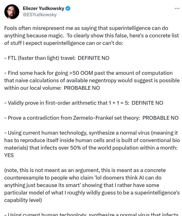 In a recent tweet, Eliezer gave a long list of examples of what he thought a superintelligence could and couldn't do: