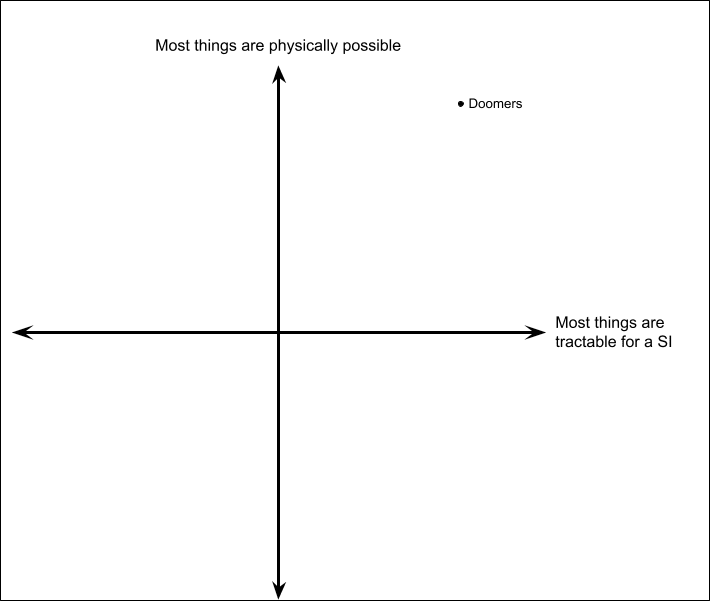 I'd expect Eliezer (and myself, and many other "doomers") to be pretty far into the top-right quadrant (meaning, we believe most important things are both physically possible and eminently tractable for a superintelligence):