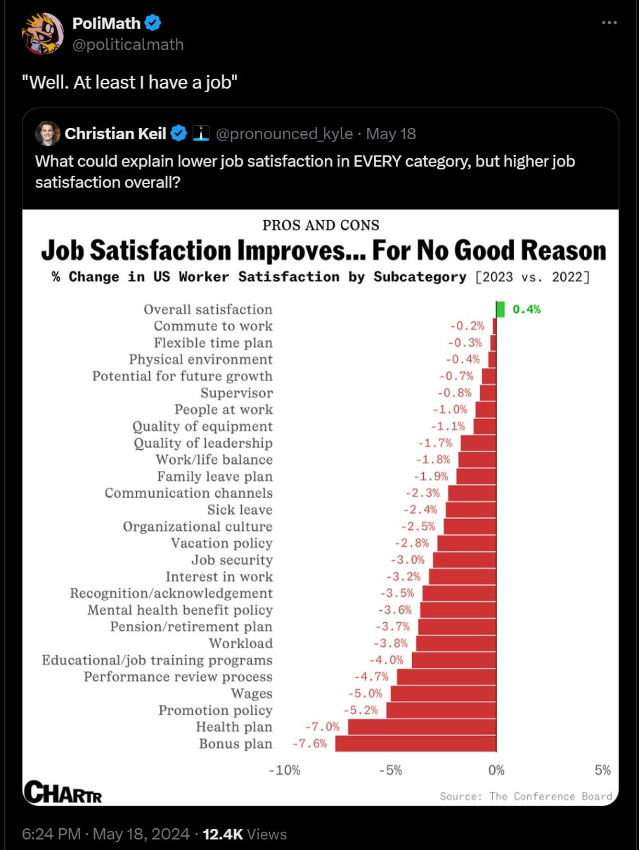 Another illustration of why people’s overall satisfaction with their situation does not tell you if times are good or people are happy with the times.