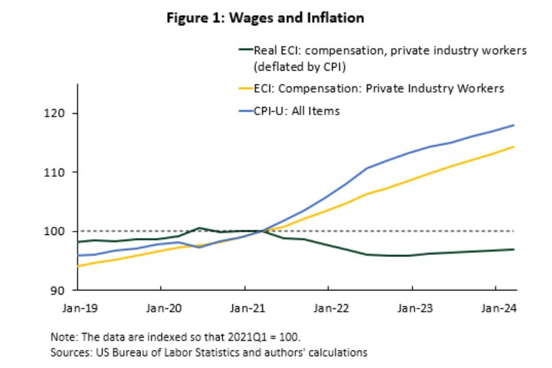 Atlanta Fed finds that real wages remain down about 3%, now rising slightly.