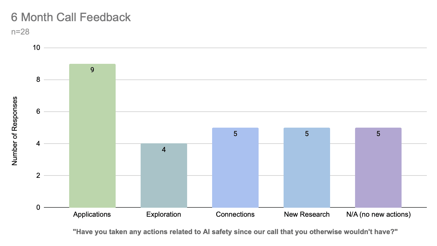 We think that accelerating a senior machine learning professional's involvement in AI safety (e.g. a professor) by 1-3 months is a great outcome, and we're excited about the opportunity to improve our call quality over the next year and support researchers even better.