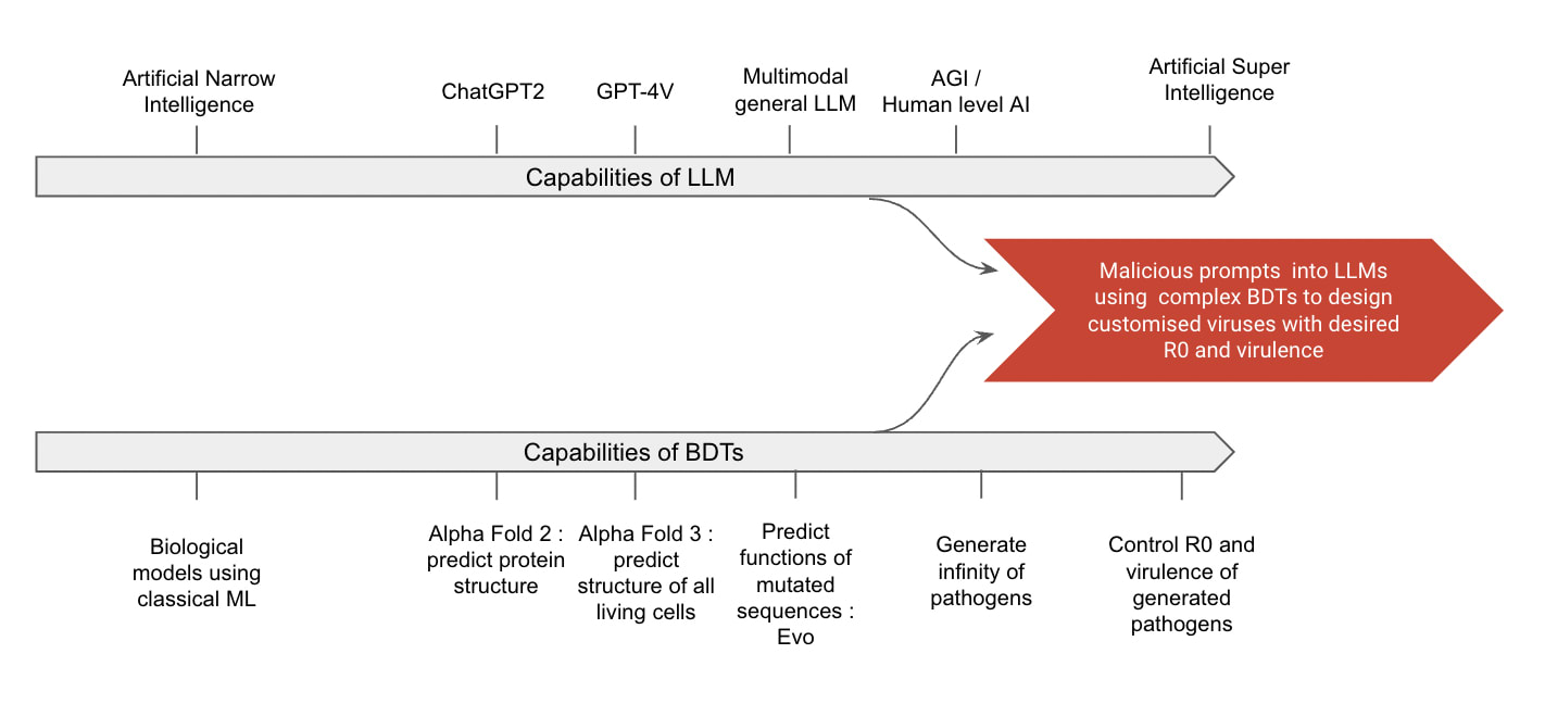 For now, with AlphaFold3 and Evo, one only has access to the weights of the models and can hence use them for inference. But how long before anyone can train on their own computers deadly biological design tools? BDT could also be used to predict and design enhancements of pathogens that make them even more harmful or to identify and manipulate key genetic components affecting their transmission and/or disease-causing properties.