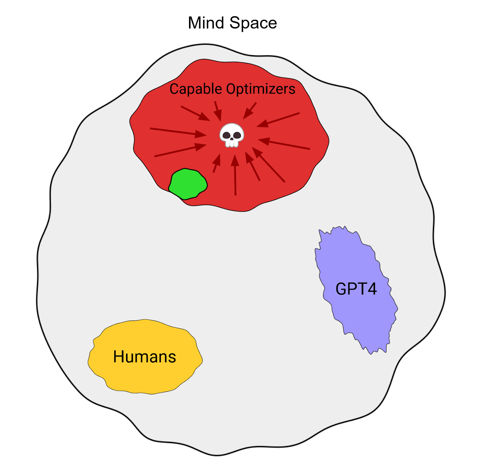 It’s very hard to predict in advance where in mind space a new AI will end up, and if it will have a non-zero overlap with the space of capable optimizers
